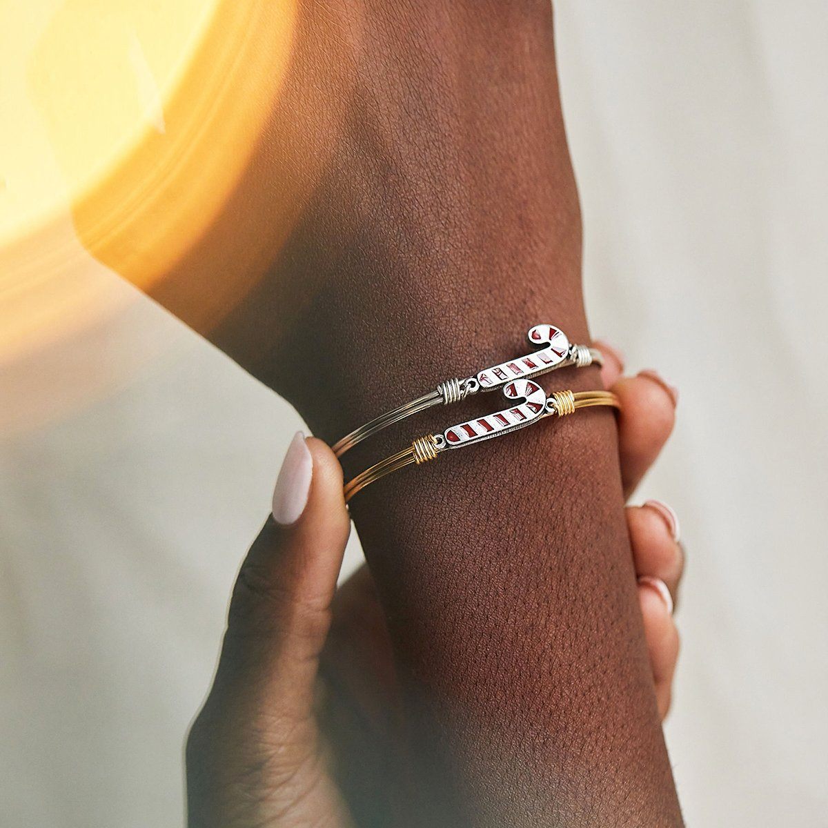 Hooked on the holidays? This piece was mint for you. (Wink.) A candy cane charm will sweet-talk your stack with a unique mix of lustrous metal and red enamel detail.