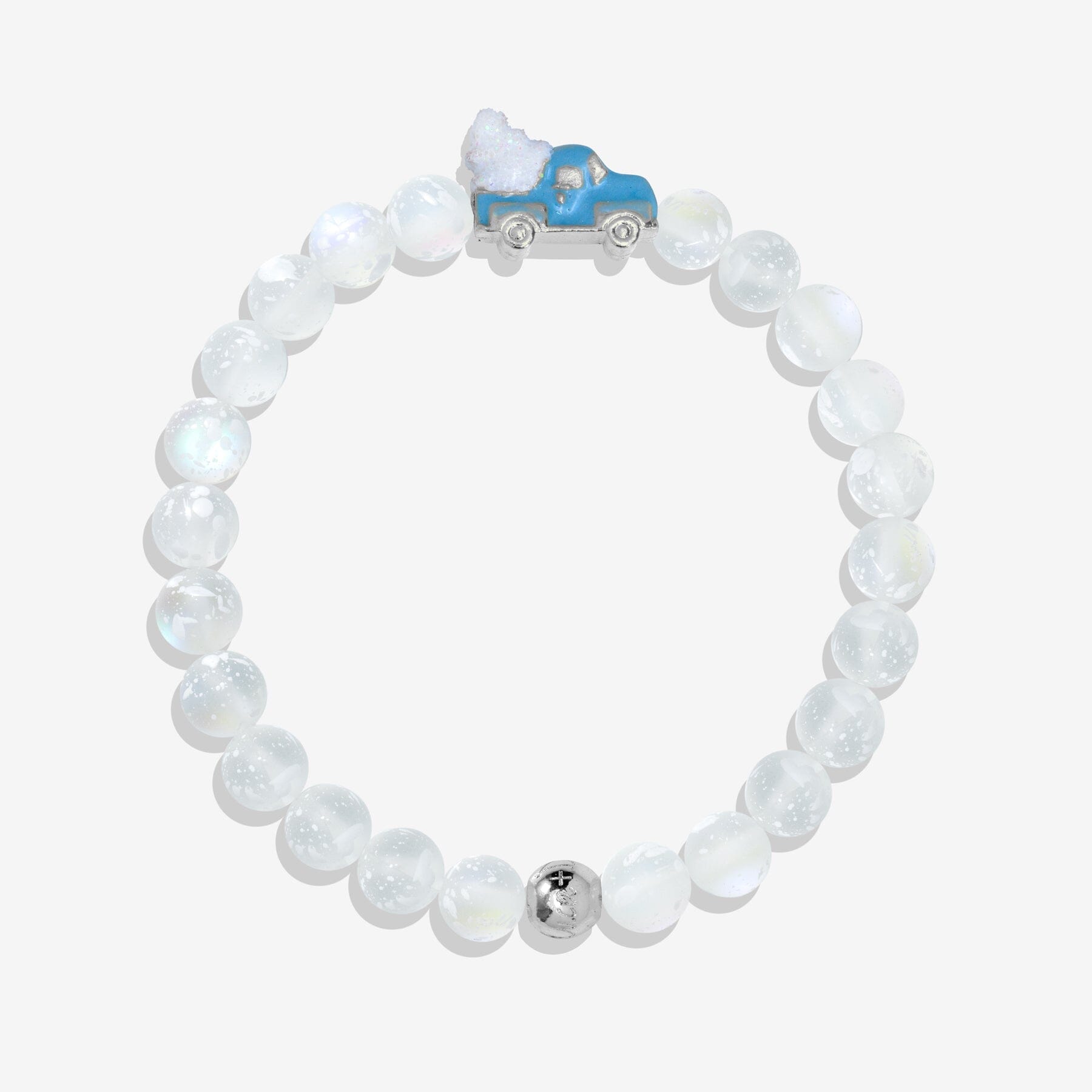 Capture the cozy charm of a snowy holiday with our delightful Blue Truck bracelet. Featuring an adorable vintage truck carrying a sparkling white Christmas tree, this handmade piece brings the magic of winter right to your wrist. The luminous white iridescent beads create a frosty, ethereal glow that's perfect for celebrating the season in style. Wear it as a reminder to embrace the joy and wonder that comes with fresh snowfall and treasured holiday traditions.
