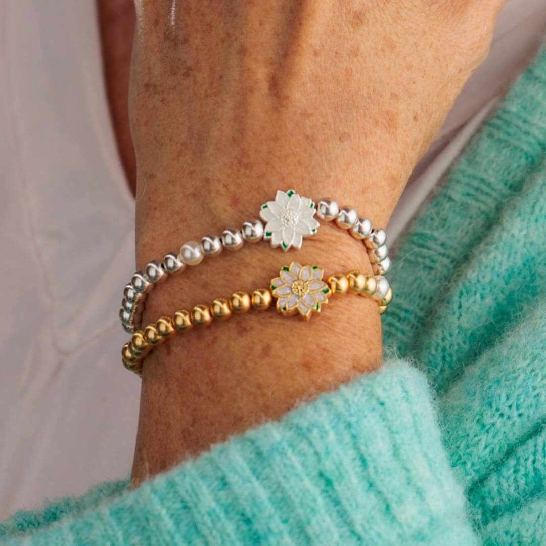 Celebrate the beauty of the season with our elegant Poinsettia bracelet. Featuring a stunning flower charm adorned with delicate white petals, vibrant green leaves, and sparkling red crystal accents, this handmade piece captures the timeless grace of this beloved holiday bloom. The luxurious gold beads paired with a lustrous pearl create a sophisticated look perfect for festive gatherings and cherished celebrations. Wear it as a reminder to embrace the warmth, beauty, and generosity that fills your heart during the holidays.
