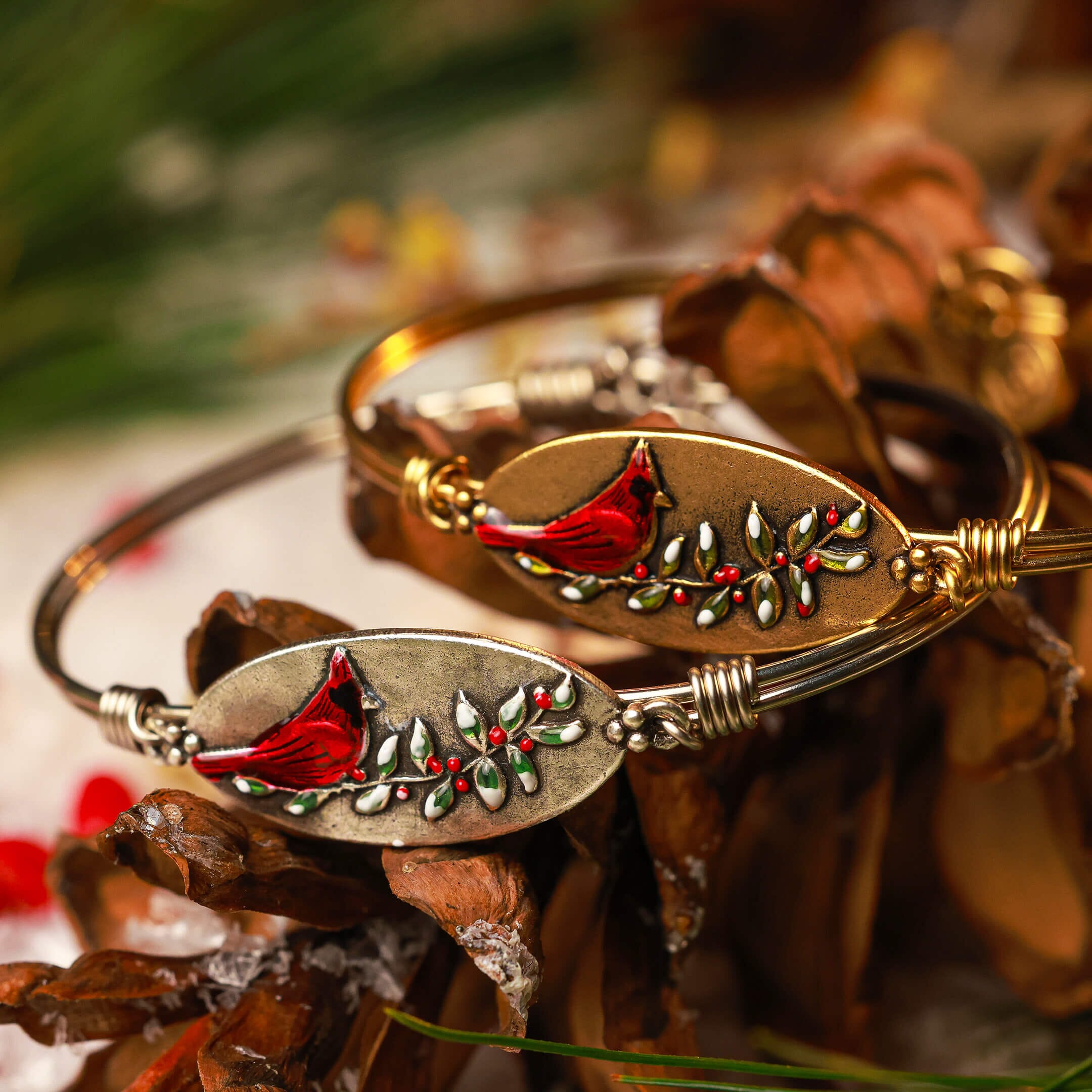 Hold a special reminder close with our Winter Forever Cardinal Bangle Bracelet, featuring a red cardinal on a branch, symbolizing the comforting thought that a loved one is always near. This simple yet meaningful piece is perfect for keeping the warmth and memories of loved ones close to your heart, especially during the winter season.