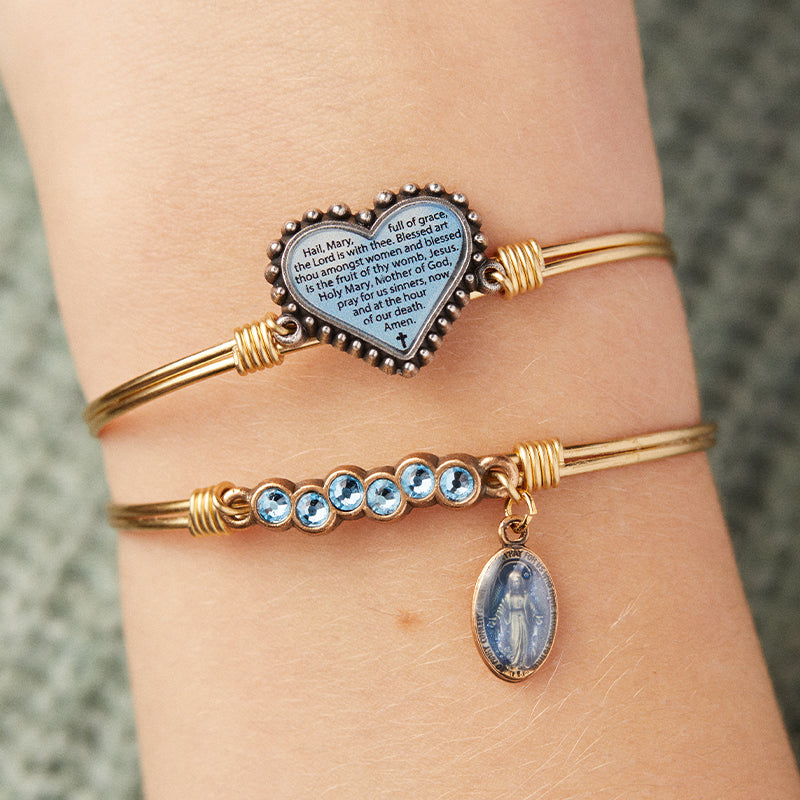 Hold perpetual grace within your heart with our handcrafted Hail Mary Bangle Bracelet. Digitally printed with the time-honored prayer, it’s framed within a heart-shaped medallion and overlayed with a clear enamel finish.
