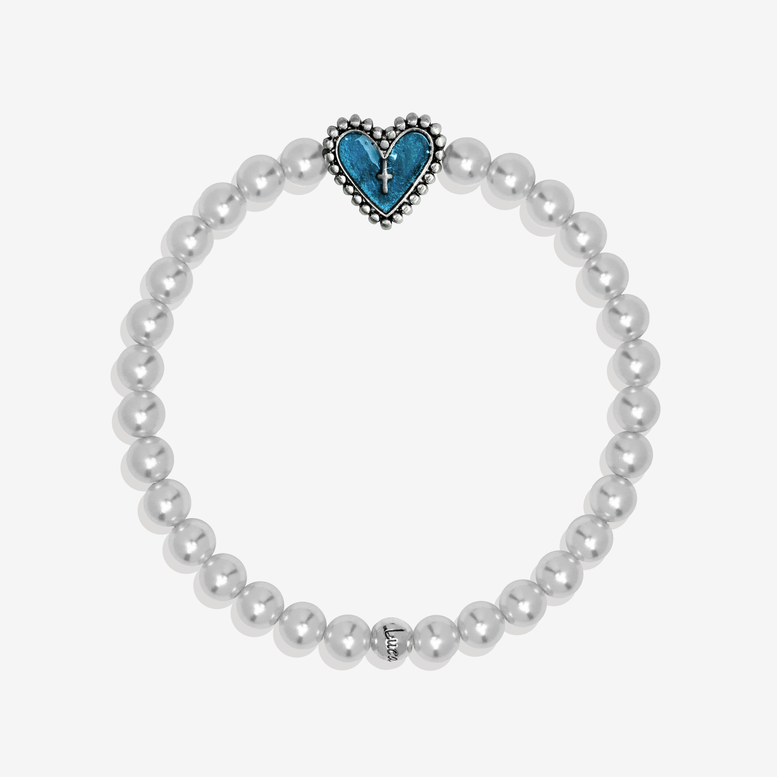 Pulsera elástica de corazón de rosario con cuentas de perlas blancas de cristal