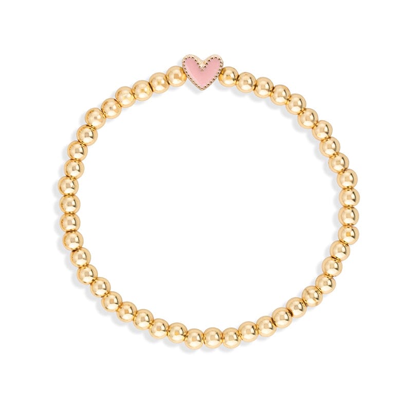 Sea lo que sea lo que te propongas, deja que se manifieste con una delicadeza impecable. Nuestra delicada pulsera elástica de corazón le da el toque perfecto de amor a cualquier escenario, con un diseño clásico de cuentas y un dije esmaltado rosa claro.