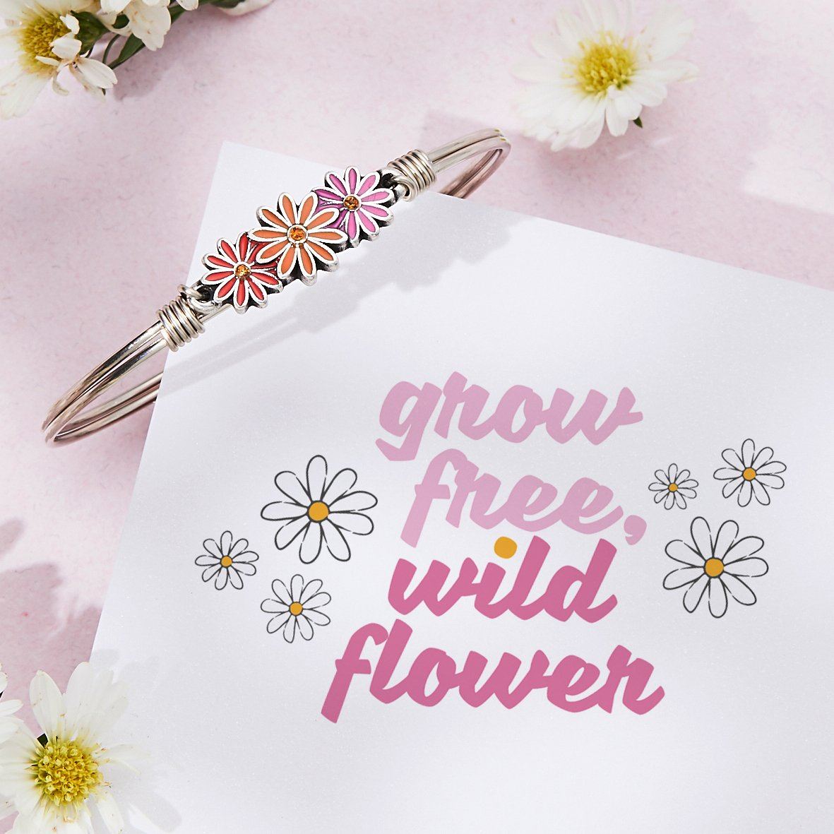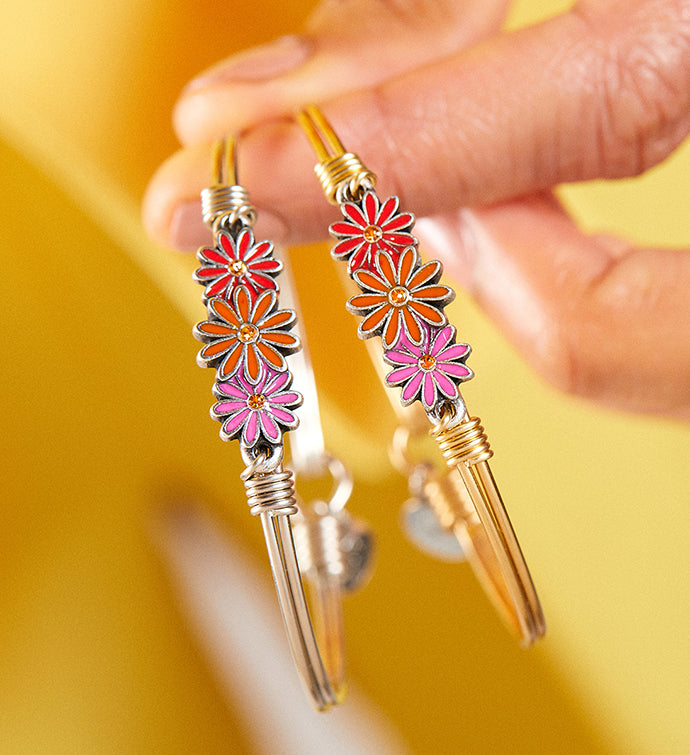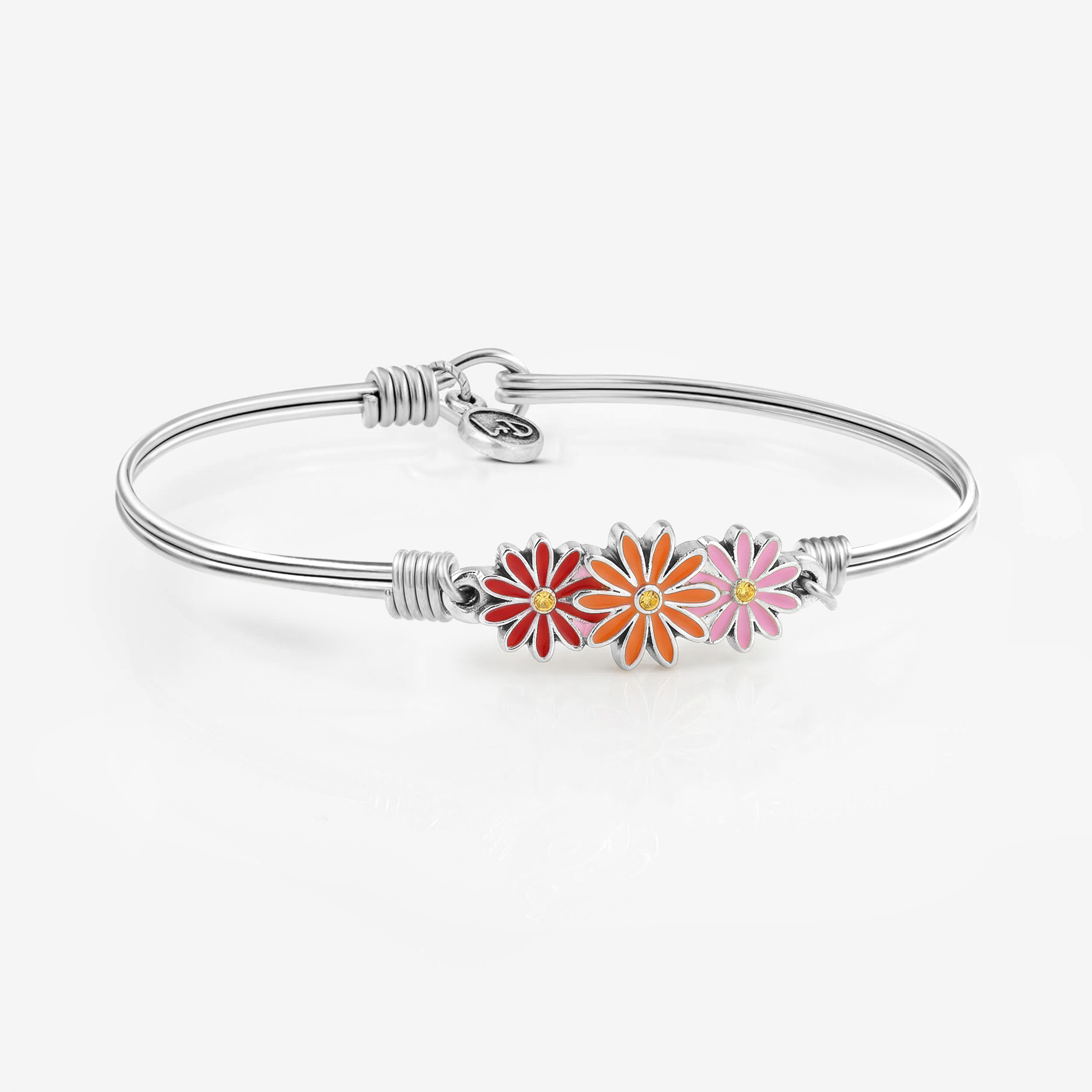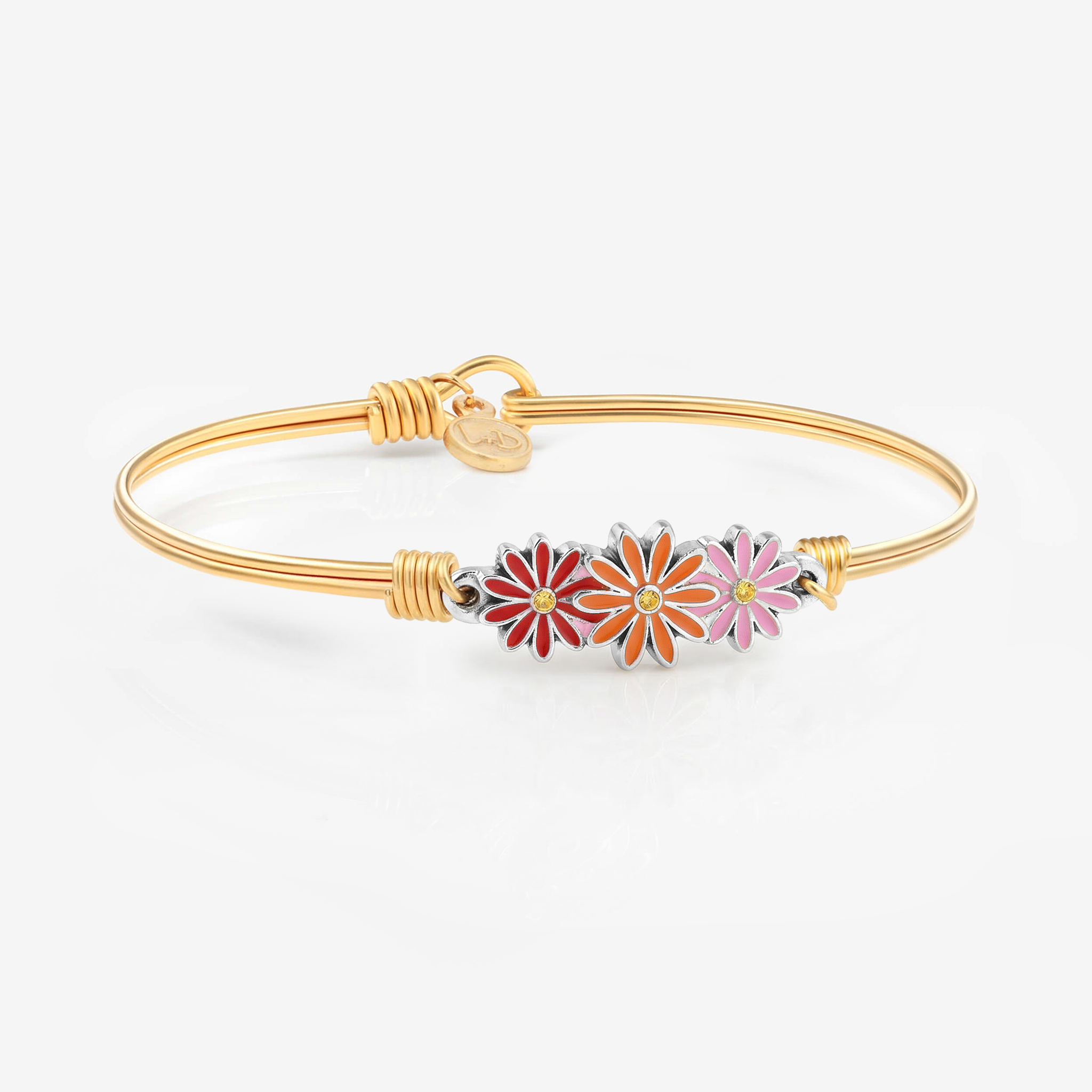All sunny, no shade. Our Gerbera daisy bracelet takes nature’s most unabashedly cheerful blossom and cranks up the color in a trio of hand-painted blooms. Finished in pink, orange and red enamel, this perfect spring bracelet features and a popping yellow crystal at the center of each flower.